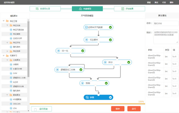 用戶全程無需編寫代碼即可完成機(jī)器學(xué)習(xí)計算任務(wù)。友好的WEB交互式界面,用戶可選擇算法,搭建包含數(shù)據(jù)預(yù)處理、特征工程及機(jī)器學(xué)習(xí)算法的工作模型,填寫算法參數(shù)并選擇計算資源,即可完成所設(shè)定的工作流程,由服務(wù)器計算任務(wù)結(jié)果并展示結(jié)果。